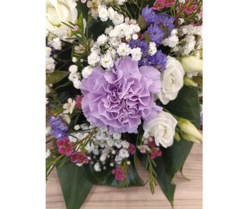 60,00 €Il bouquet è composto da lilium rosa, lisianthus rosa, statice lilla, roselline a cespuglio bianche e fucsia e wax flower nelle tonalità lilla e fucsia.