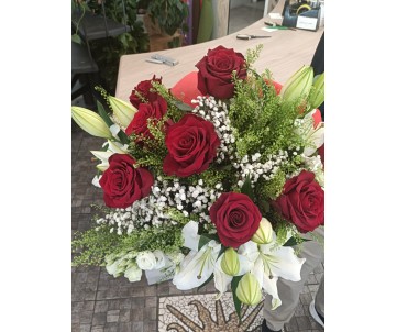 80,00 €Bouquet elegante con rose rosse e lilium bianchi, arricchito da lisianthus e gypsophila. Una composizione raffinata, perfetta per esprimere amore e celebrare momenti speciali con stile.